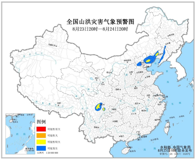 水利部和中国气象局8月23日18时联合发布黄色山洪灾害气象预警: